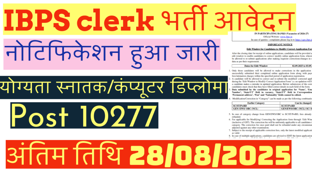 IBPS clerk स्नातक पास युवाओं 10277पदों पर बम्पर भर्ती का नोटिफिकेशन जारी कर दिया है इसके लिए ऑनलाइन आवेदन फॉर्म 28 अगस्त तक भरे जाएंगे। क्लर्क में भर्ती का इंतजार कर रहे तमाम युवाओं के लिए भर्ती के लिए सुनहरा मौका आया है क्लर्क के 10277पदों पर भर्ती का विज्ञापन जारी कर दिया है इसके तहत IBPS clerk के 10277 पदों पर भर्ती की जाएगी इस भर्ती के लिए अभ्यर्थियों से ऑनलाइन आवेदन